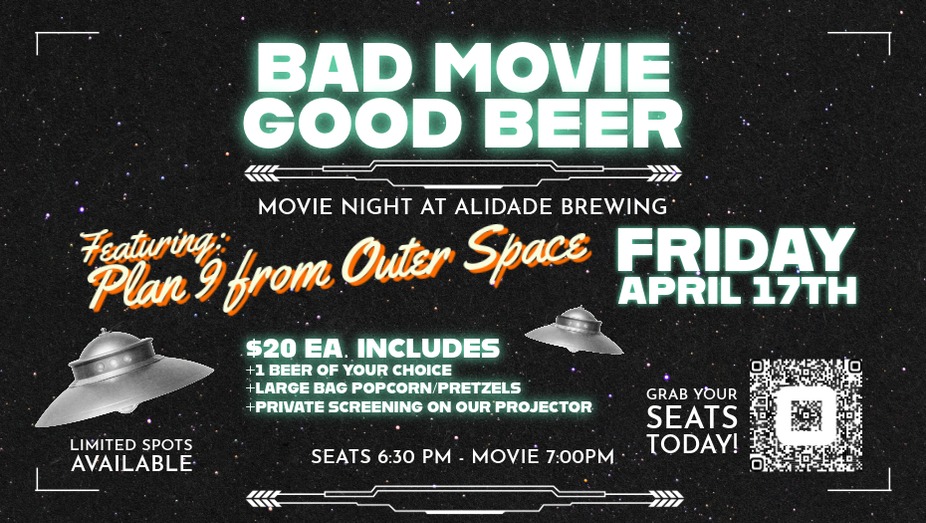 BAD MOVIE. GOOD BEER. PLAN 9 FROM OUTER SPACE The worst movie ever made… allegedly. Friday April 17 Seating 6:30 PM Movie 7:00 PM Ticket Includes (1 Ticket = 1 Entry) +1 Beer + Popcorn or Pretzel + Private Screening on our Projector Reserve your seat here!